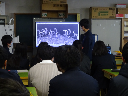 物理&生物分野では、日立ハイテクノロジーズ様より貸していただいた電子顕微鏡を用いた観察、及び使い方のレクチャーを受けました。講師を本校3年生の先輩らが務め、後輩たちへクイズも交えながら、楽しく講義を受けました。