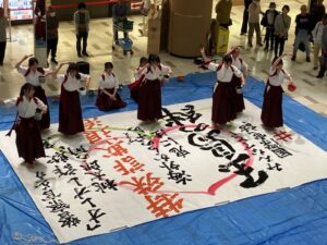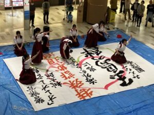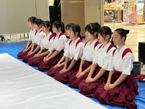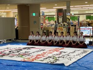 会場には、多くの方が2階や3階から観覧される中、本校の書道部は堂々としたパフォーマンスを発揮し、完成した際には大きな拍手が店内を響き渡りました。