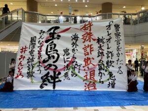 詐欺撲滅キャンペーンが天満屋ハッピータウン鴨方店で行われ、本校書道部が地域の方々に書道を通して詐欺撲滅のメッセージを伝えました。