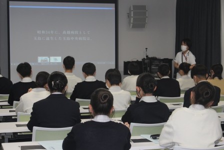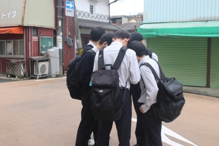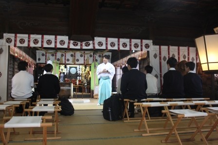 ・羽黒神社にて、玉島高校の卒業生である神主さまにお話しをしていただきました。生徒たちは羽黒神社にいる白い猫が気になったようです。