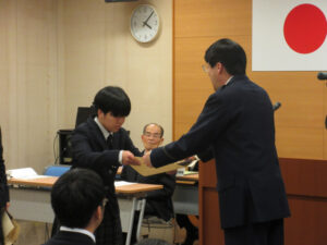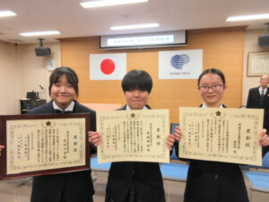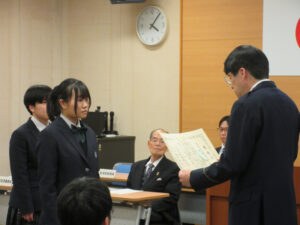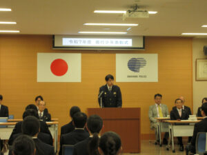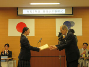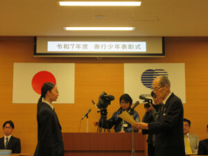 玉島警察署で、令和7年度善行少年表彰式があり、個人の部で1年生2名と、団体の部で書道部が表彰されました。
