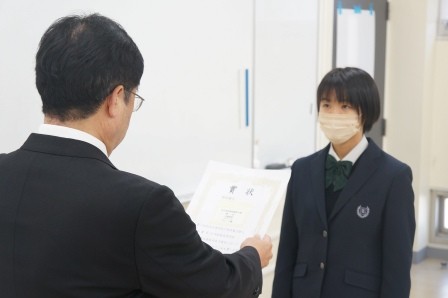 表彰伝達式では、中国高等学校新人陸上競技対校選手権大会などで陸上競技部が、第7回中国高等学校少林寺拳法新人大会で少林寺拳法が表彰されました。
