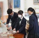 お昼は白華ホールで一緒にお弁当を食べ、茶道部が食後にお茶とお菓子でおもてなしをしました。